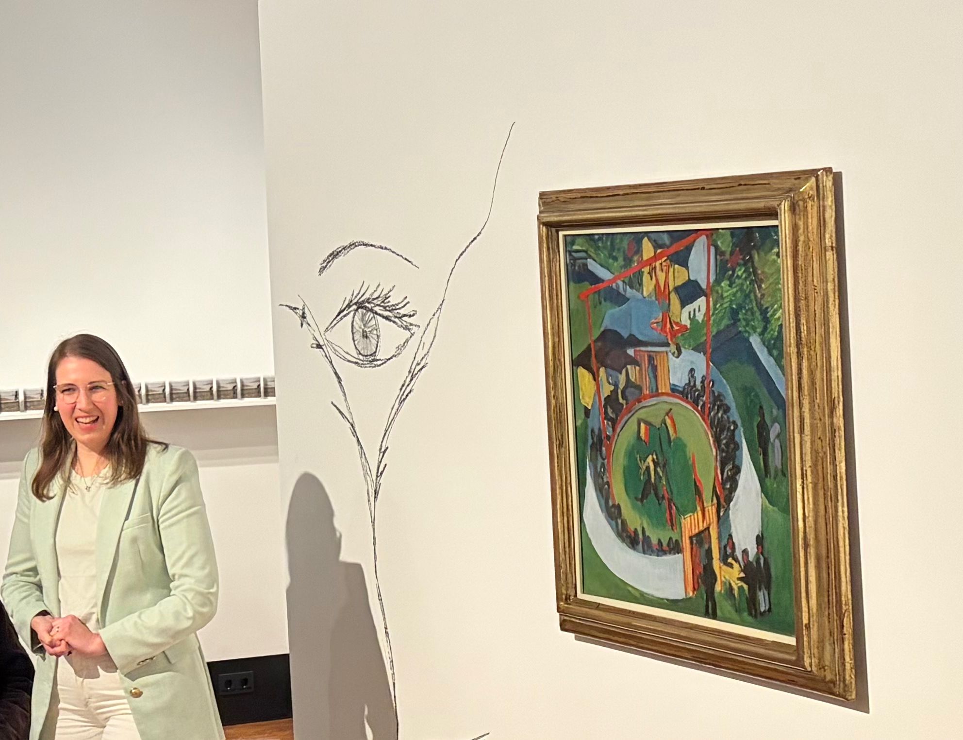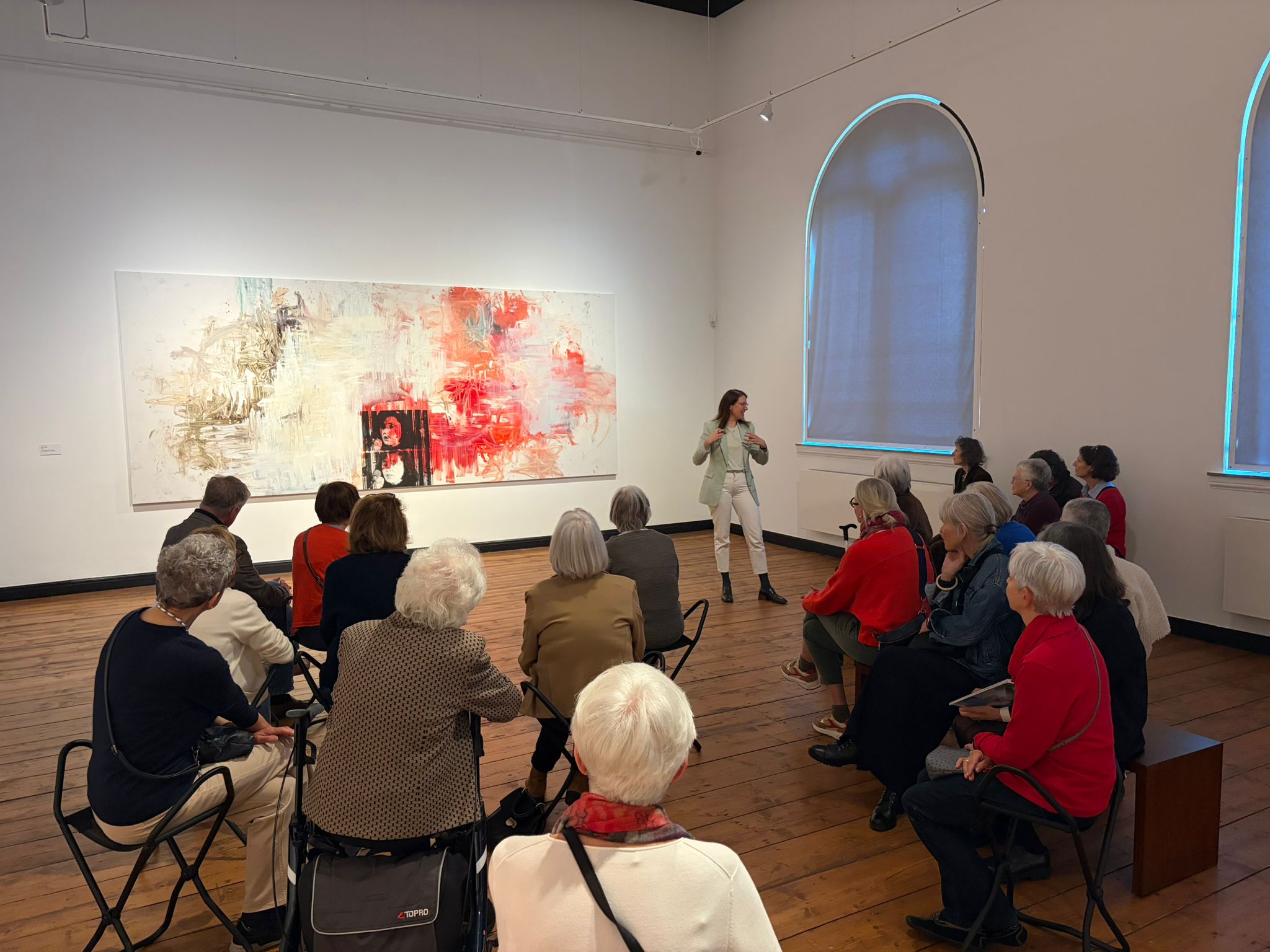 Am 21. April 2026 ging es mit Dr. Anna Heinze im Augusteum durch die jüngst eröffnete Ausstellung der international anerkannten Künstlerin, Leyla Yenirce, „Werdegang“, die viel Austauschpotenzial über Herkunft und Identität bot. Ihre multimediale Werkschau hatte sie eigens für Oldenburg geschaffen, die Stadt, die für Leyla Yenirce nach der Flucht als Dreijährige aus dem ehemaligen Kurdistan ihre erste Heimat in Deutschland wurde. So begegneten wir u. a. Zeichnungen aus ihrem Kinderzimmer, erfuhren, welche Rolle Kirchners Gemälde „Der Wanderzirkus“ für sie spielte und was es mit dem „Tassen-Daumen-Kino“ auf sicht hat. Zudem erhielten wir viele persönliche Einblicke über die Künstlerin. So bspw., dass sie sich täglich morgens bewusst bis zu zwei Stunden Zeit für Literaturgenuss nimmt. In ihrem Berliner Atelier befindet sich u. a. eine Kleist-Gesamtausgabe, die Yenirce bereits zum zweiten Mal liest. Welche Vorbilder ihr facettenreiches Interesse an Literatur, Politik, Kunst und Bildung geweckt haben, erläuterte uns Dr. Anna Heinze an Hand der collagenartigen Gemälde im „Chor der Frauen“. Großflächige Formate, die laut der Künstlerin enorm viel Energie im Arbeitsprozess abverlangen. Daher verwunderte es uns auch nicht, dass Leyla Yenirce sich diese Power beim Kick-Boxen antrainiert. – Ein herzliches Dankeschön an Dich, liebe Anna, für diesen außergewöhnlichen Ausstellungsbesuch!